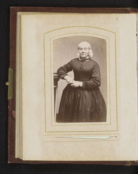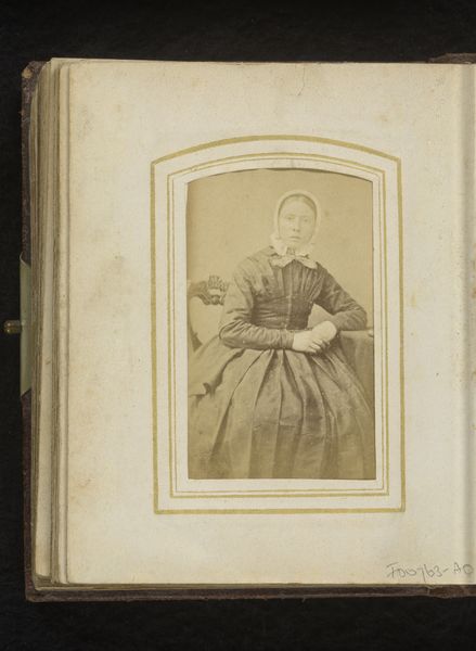 Editor: We're looking at a work called "Portret van een jonge vrouw," or "Portrait of a Young Woman," dating from between 1850 and 1890. It’s an albumen print, giving it that warm, sepia tone. There's something very stoic about the woman's pose and expression. What stands out to you about this portrait? Curator: What I see here is not just a portrait, but a carefully constructed image reflecting the social and cultural values of the time. Photography in the mid-19th century was becoming more accessible, but it still carried a certain weight, especially for portraiture. Editor: In what sense? Curator: This wasn't a snapshot; posing for a photograph required time and resources. Therefore, portraits like these were often intended to convey status, respectability, and adherence to social norms. Notice her attire – the elaborate dress and bow. It signifies a certain level of affluence, or at least aspirations towards it. How do you think the context of this portrait affects our understanding of this woman? Editor: I guess I hadn’t considered the deliberate message the portrait sends. Thinking about the role of photography, I now appreciate it as a powerful tool for shaping public identity in the 19th century, rather than simply capturing reality. Curator: Precisely. And it prompts us to question who had the power to control these images and what narratives they promoted. The photograph wasn't just about representation; it was about power and control. Editor: I hadn’t considered how this image contributes to that narrative. Thank you for widening my perspective! Curator: My pleasure! Looking closely helps us reveal the layers of meaning embedded within seemingly simple portraits.