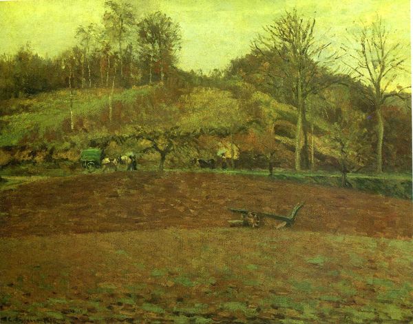 Editor: This painting, titled "Forest Worker in the Wood Quarry" by Hugo Mühlig, appears to be an oil painting. The muted colors create a somber mood as it depicts figures working on a desolate hillside. What draws your eye in this piece? Curator: Well, for me, it's the explicit depiction of labor and the transformation of natural resources that's compelling. The painting documents a specific industrial process: quarrying wood. How does Mühlig’s rendering of labor speak to the social realities of his time? Editor: It feels…mundane. Like work stripped of any romanticism. Was there anything particularly notable about wood quarrying during this time that the artist might be commenting on? Curator: Absolutely. Think about the growing demands of industrialization. This isn’t just about some picturesque scene; it's about the increasingly intense exploitation of natural resources to fuel industrial growth. The materials – the oil paint itself, the wood being harvested – are central. Where does the painting sit between genres, like landscape and genre painting, and how does it blur the lines? Editor: So you're suggesting Mühlig uses the traditional genre of landscape to highlight a very specific economic activity, making the means of production itself the subject? It really forces you to consider the human impact on the environment. Curator: Precisely! Consider the brushstrokes, the seemingly casual arrangement of the workers. They underscore the physical nature of this work. The lack of idealization removes the romantic lens we often associate with landscape painting. What are the ethics of painting a scene of extraction like this – does he celebrate the laborers, or lament a shift toward ecological harm? Editor: This really shifts how I see the painting. I was focused on the subdued palette, but now I realize that the subject matter, the act of transforming a forest into raw material, is the true focus. It's both beautiful and unsettling. Curator: Indeed. Mühlig challenges us to consider not just what we see, but how and why it's made and what broader forces drive its creation and the labour portrayed. It makes you question the nature of art’s raw materials and its reflection on the societal issues tied to their acquisition.