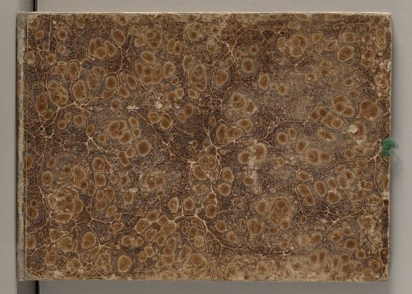 Curator: Here we have a sketchbook from the mid-19th century, specifically between 1840 and 1845, with 43 pages. The artist is Johannes Tavenraat, and the piece resides at the Rijksmuseum. Editor: Well, just glancing at the cover, it’s immediately textural, like a topographical map or a strange, fossilized skin. I wonder about its scale; are the marks delicate and fine, or broader strokes? Curator: I'd argue the cover itself operates on an abstract, two-dimensional plane. The chromatic interplay between the dark organic shapes and the lighter matrix evokes a profound sense of depth, even while resisting perspectival cues. Editor: Indeed. And thinking about how this marbling was achieved, probably through artisanal techniques like floating ink or paste—it represents a fascinating tension. A practical binding protecting the presumed ‘art,’ crafted through processes of almost accidental aesthetic value themselves. The craft literally contains the creation. Curator: Precisely. Tavenraat, known for an inclination towards impressionistic techniques, offers the viewer a dynamic surface—one of seemingly spontaneous compositions, yet constrained by the inherent rectangular frame of its materiality. Editor: It makes you consider the economic background and distribution channels for these tools. What sort of paper did the artist favor? Was the production strictly individualized, or factory-based and globally imported? What were the artist's resources and how did it affect his mark-making process? These parameters of making must always be at the base of an artwork interpretation. Curator: Such constraints arguably amplify the expressive gesture embedded within, revealing artistic intervention despite its objective bounds. The artist navigates within these limits and we respond accordingly. Editor: For me, looking at the physical wear and evidence of process, the sketchbook is a reminder of the social world from which artistic creation arises. It provokes me to understand labor and consumption. Curator: A rewarding object indeed, it's always thrilling to re-examine those boundaries of intention and outcome. Editor: Agreed; each mark becomes a small relic within the object’s layered history.