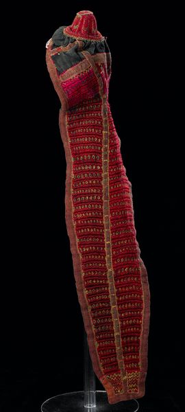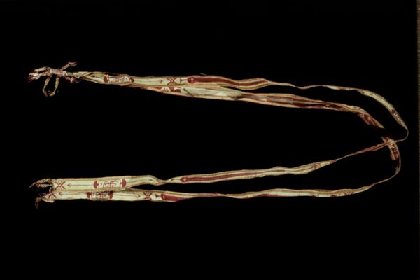 This headband, or wincha, was carefully woven using a technique that creates a double-faced fabric, thick and sturdy. With its symmetrical patterns, the headband's design features a red-orange color interwoven with geometric motifs in white, black, and purple, culminating in delicate tasseled ends. The creation of such an object would have been time-consuming work, and the colors may well have been derived from natural dyes. In Andean communities, such headbands are used to hold hats or other head coverings in place. Textiles like this one reflect a deep connection to cultural heritage and identity. They also serve as a reminder of the skill and labor involved in their creation, a contrast to mass-produced, machine-made textiles. Considering this headband as a work of art allows us to appreciate the techniques and traditions that have been passed down through generations, blurring the lines between craft, design, and art.