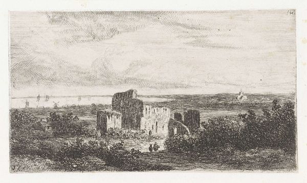 This etching, "Ruïne in een weiland," was made by Gerard van Nijmegen in the 18th century. It shows a ruin in a field, created through the intricate process of etching, using metal plates and acid to create this delicate design. The material of the print – paper – becomes a carrier of history, preserving the artist's vision of a crumbling structure. Van Nijmegen's technique highlights the contrast between the permanence of the ruin and the fragility of the printed image. The etching process, with its reliance on skilled craftsmanship, draws attention to the labor involved in artistic creation. Each line etched into the metal plate represents a deliberate act, a testament to the artist's meticulous attention to detail. By focusing on the material and the making, we recognize the value of craft in translating historical and social narratives into tangible form, challenging the conventional hierarchy between fine art and craft.