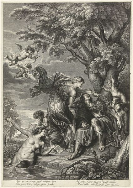Curator: This print, titled "The Conversion of Paul," was created by Cornelis Schut sometime between 1618 and 1655, here on display at the Rijksmuseum. What's your first reaction to this piece? Editor: The dynamism is immediate! The diagonal composition, the swirling figures… It practically leaps off the page, or would if it had color to fully animate its liveliness. Curator: Schut was working within the broader context of the Baroque period, an era known for its dramatic flair and emotional intensity, particularly within religious imagery. The narrative of Paul's conversion was incredibly important, showing how faith could dramatically change individuals, even leaders of religious persecution, a powerful sentiment during the Counter-Reformation. Editor: The angel's diagonal lines really energize that upper portion of the print. It contrasts wonderfully with the solidity of the figures on the ground; you can feel the celestial breaking through the earthly realm! Curator: This subject held immense socio-political weight during a period of intense religious conflict. Depictions such as this reinforced established religious doctrine while serving as a call for both conversion and religious tolerance. Editor: I think also you could use some semiotic interpretation. The fall of Paul suggests an erasure or subversion of his previous life. What falls away has, thus, liberated this raw space that then becomes defined by Paul's new spiritual awakening. Curator: Prints like this, by artists such as Schut, circulated widely and became vital tools for disseminating ideological narratives to broad audiences. This depiction emphasizes not only divine intervention but the potential for societal transformation through faith. Editor: The intricate line work creates a sort of delicate chaos, doesn't it? A fitting visual for a moment of profound upheaval and spiritual rebirth, very intense! Curator: Considering the socio-historical climate during which Schut produced "The Conversion of Paul" highlights the persuasive strength that art held as it navigated the changing religious landscape. Editor: Yes, examining the way Schut layers compositional energy to underscore narrative is essential to grasping the enduring legacy of this piece.