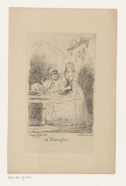 "The Old Bachelor" is an engraving by J.J. Grandville, part of an edition of The Complete Works of Béranger. It emerged during a period of significant social upheaval in France, a time of shifting gender roles and class structures. The print depicts an older man seated and reaching up to touch a younger woman who is standing. This image offers a window into the complex intersections of age, gender, and power. Consider the power dynamics at play here: the vulnerability of youth versus the assumed authority of age, and the economic disparities that might lead a young woman into such a situation. Grandville’s stark lines and exaggerated features highlight the societal anxieties around courtship and marriage during the 19th century. It prompts us to reflect on the emotional nuances of the scene. Is it tender, transactional, or something in between? The image invites us to consider how societal expectations shape our understanding of relationships and individual autonomy.
