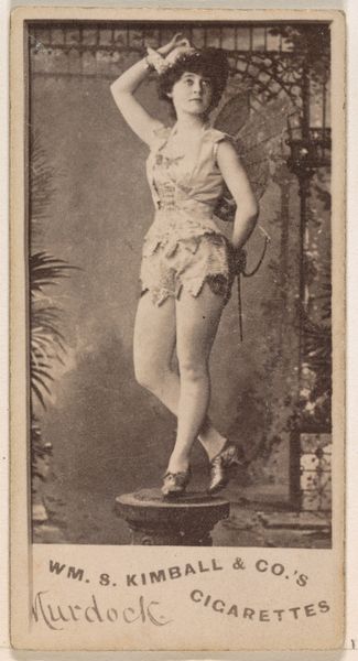 Card Number 178, a promotional card for Duke's Cameo Cigarettes from around 1900, presents actress Dallie Burns in sepia tones. The composition is sharply divided: on the right, Burns leans against a heavily textured faux rock, while to the left, a dark, undefined landscape fades into the background. The diagonal line formed by Burns' body creates a sense of movement, but it's rigidly contained by her theatrical costume, a series of horizontal bands that segment her torso. These structural divisions extend to the lower part of the card, where the advertisement text is neatly arranged. The card functions as a semiotic system, using Burns' image to signify luxury and allure, coded through the visual language of theater and performance. The rigid structure of the composition and the clear separation of image and text suggest a desire to control and categorize meaning, aligning the actress with a consumable commodity. The sepia tones and the textured background create a sense of nostalgia, inviting the viewer to reflect on the changing landscape of popular culture and representation.