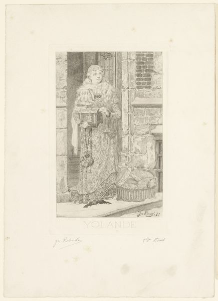 Curator: Here we have Jos Ratinckx's 1887 intaglio print titled "Young woman with valuables and bread standing in front of a house in the snow." What catches your eye? Editor: The severity of the setting really jumps out. She's enveloped by stone, the hard architecture contrasting sharply with the presumed softness of her furs. There's a bleakness. Curator: It's tempting to read that bleakness through the lens of late 19th-century gender dynamics. Consider the figure of the woman here: what possibilities do her class and station afford her, and what freedoms are simultaneously denied? Editor: The jewelry, the elaborate dress, that box she holds, they all denote privilege. The house in the snowy street also represents privilege and suggests stability, hearth, and home. And the basket of bread reminds of offering and the basic necessity to live. Curator: Certainly, the domestic sphere was both a sanctuary and a cage for women. This print invites us to think about the complexities of wealth and visibility; this figure is on display, but what does it mean for a woman to be 'seen' in this historical moment? Editor: Her eyes. They reveal a longing, and vulnerability that counters her exterior riches. A quiet desperation to be heard maybe? It is all captured by the technique in this realism style. Curator: Exactly! Ratinckx's choice to depict her via realistic imagery, places her firmly within a recognizable social order. It gives the figure her own distinct cultural value, but how much agency does she truly possess? The bread might symbolize giving, but might also denote keeping. The bread for those inside or for people in need outside? Editor: Those repeating right angles and linear stone blocks and that hard threshold she seems hesitant to pass represent boundaries and restrictions; her role is clearly defined. But her internal emotions, which reflect our collective aspirations for agency and autonomy, break free from it all. The intaglio offers sharp precision and soft grey tones to capture it all in high detail. Curator: Indeed. Ratinckx’s engraving acts as a mirror reflecting back on us not just an individual, but broader questions of gender, power, and class struggle at a time of societal shift. Editor: Looking closer it reveals an intersection between representation and self. I leave seeing her emotions, dreams, anxieties and concerns more clearly and feel moved.