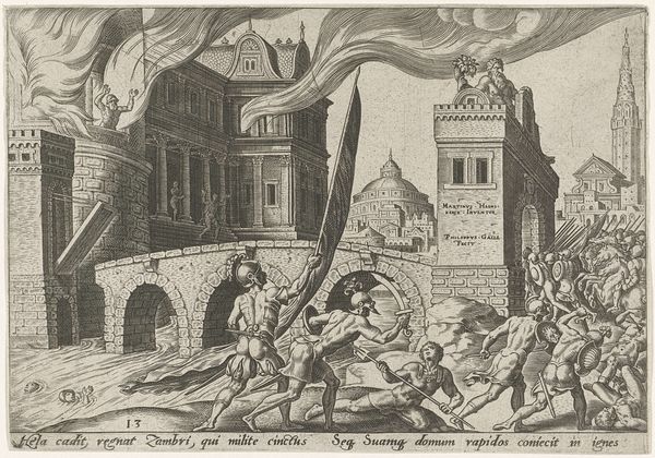 Editor: So, here we have "The Destruction of Jerusalem by Emperor Titus," a 1569 engraving by Philips Galle, housed here at the Rijksmuseum. It's a pretty stark image. What I find most striking is how meticulously detailed it is, especially considering the subject matter is utter devastation. What do you see in this piece? Curator: I see the labor invested in creating this narrative. Think about the process of engraving – the skilled artisan meticulously carving lines into a metal plate, a craft learned through years of apprenticeship. Galle wasn’t just depicting destruction; he was performing skilled labor within a very specific socio-economic context of print production and distribution. The final artwork as such is a precious metal-originated artwork, whose consumption allows us to comprehend a great deal of socio-economic dynamics. Editor: So, it's about the physical making, rather than just the image itself? I guess I was drawn in by the scene depicted – all the chaos and drama. Curator: Precisely! But what does that "chaos" actually consist of? Notice how Galle has organized the composition, dividing it through orthogonals: on one side, the imperial forces, active in destruction, on the other, the doomed architectural mass. I’m curious; to whom would this type of scene appeal to the most? Who would spend a great deal of currency on such representation? Editor: Presumably, patrons, religious leaders. Those seeking propaganda in favour of the Roman Empire or perhaps a warning about the ephemerality of power? Curator: Exactly. The act of creating and consuming art is always embedded within power structures. In its materiality the artwork speaks on behalf of labour, production, context and power relations. Editor: I see your point. By considering the means of production, we uncover deeper layers of meaning beyond the surface image. It makes you think about who had access to art like this and the messages they were meant to receive. Curator: And that's the key - to unearth not just *what* is shown, but *how* it was made, and for *whom*. A profound way to contextualize artwork like this!