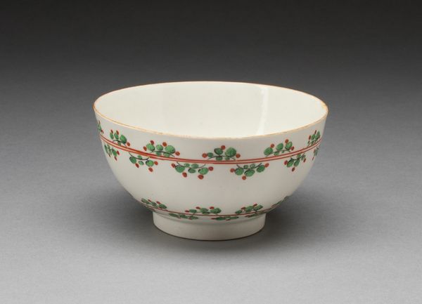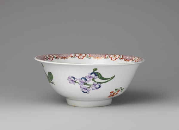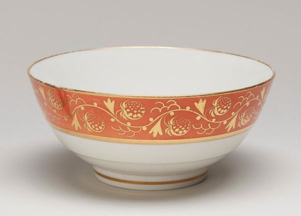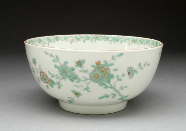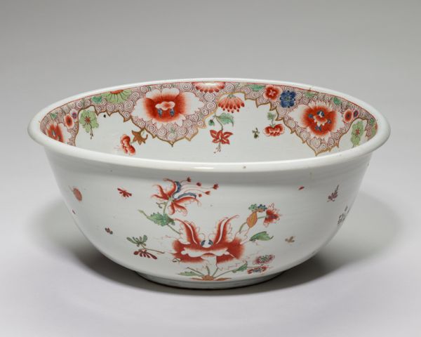 Curator: Look at this, will you? Worcester Royal Porcelain Company’s “Slop Bowl,” circa 1770. A rather delightful piece, wouldn't you agree? Editor: It’s…charming. I immediately notice the Rococo floral pattern—delicate, almost whimsical. The colors are surprisingly vibrant for a piece of this age. It projects elegance. Curator: Elegance yes, but think about function. A slop bowl isn't exactly high art, is it? More about tea rituals and societal norms. Porcelain became quite the status symbol, didn't it? Mass produced yet meticulously decorated… Editor: Precisely! But that tension between mass production and artistic detail is precisely what makes it compelling! The eye dances across the surface, following the undulating gold lines, catching the intricate floral designs. See how the red accents pull you in? The asymmetrical arrangement enhances that visual play. Curator: I'm interested in how such wares shaped social behavior. Tea drinking was hardly a solitary affair, and the material—porcelain—suggests certain levels of industrial activity and class distinctions of the time. How available and expensive was it for the working classes to purchase similar items? Who did it benefit? Editor: The artist, of course, exercises deliberate restraint. Imagine how cluttered and oppressive this could have looked with less negative space. And, the subtle variations in each floral element. The repeated elements are skillfully rendered; however, the asymmetry is not only striking but it prevents visual fatigue from setting in. Curator: But who fired it? Who ground the materials? What about child labor in mines to obtain the ore necessary for the pigments? Was its Rococo design aspirational for the middle class who wished to imitate upper classes or an entirely novel invention with limited appeal? These concerns ground any romantic ideal you might associate with something like this. Editor: A compelling juxtaposition! This little bowl encapsulates those vast economic divides and emerging industries of that period. The materiality and its relation to both production and consumption opens this up, doesn't it? It’s remarkable that so many competing forces converge in something so seemingly simple and ornamental. Curator: I see now, focusing purely on labor obscures other significant aspects! Examining the cultural and commercial context really does enrich the whole reading.