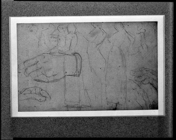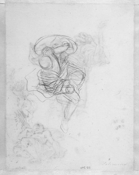Editor: This is Georges Seurat's drawing, "Henry IV Playing with His Children," held at the Harvard Art Museums. It seems very sparse. What do you see in this composition? Curator: The line quality is quite deliberate, wouldn't you agree? Note how the artist employed hatching and cross-hatching to suggest volume and form, a clear indication of his engagement with academic drawing practices. How do the contours guide your eye? Editor: I see how the lines create a sense of movement, but I'm curious about the isolated placement of the figures on the page. Curator: Indeed. The negative space surrounding the figures is not merely empty; it actively contributes to the overall composition. What sort of relationship do you see between the figures themselves? Editor: It feels incomplete, almost like a study rather than a finished work. Curator: Precisely. It is a study of form, of motion, of balance. The essence of form takes precedence over narrative detail. Editor: I hadn't thought of it that way. It does seem that Seurat was more interested in the art of making art than in creating a perfect picture.