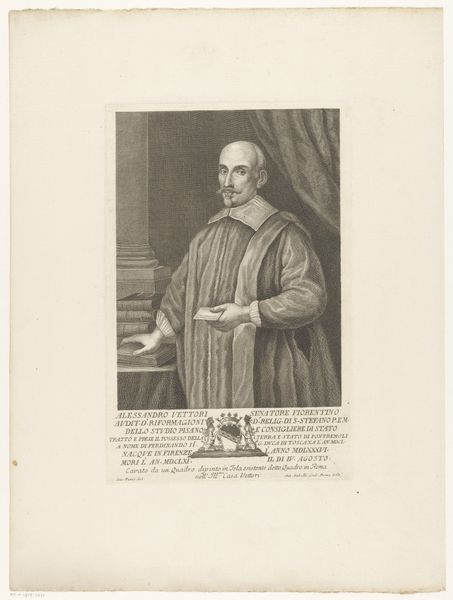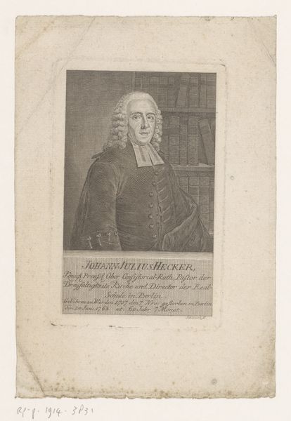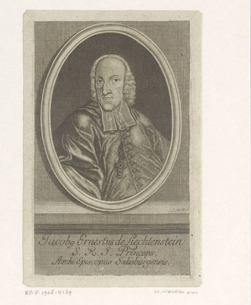 Editor: So, this print, "Portret van Joachim Oporin," dating between 1753 and 1803, by Johann Christian Gottfried Fritzsch, is an engraving. It’s quite formal, almost severe in its presentation. The sharp lines of the engraving seem to emphasize the sitter’s stern expression. What do you see in this piece from an art perspective? Curator: From a formalist perspective, it's essential to analyze the intrinsic visual elements. Note the contrast, for instance. The sharp delineation of lines creates distinct boundaries, almost compartmentalizing the image. Editor: Compartmentalizing? Curator: Precisely. Consider how the figure is framed against the backdrop. Do you observe the stark differences in texture between the sitter's face, his clothing, and the background? How do these contrasting textures and patterns play with light? Editor: I see what you mean. The wig, for instance, appears quite luminous, which draws the eye to the face, while the robe has more muted tonal gradations. Curator: And consider the lines themselves. How would you characterize the lines creating his facial features versus the draped curtain in the background? Editor: The face has really crisp lines. In contrast, the background has finer, softer ones. I now see that the textures and lines form a contrast that highlights the sitter. Curator: The engraving medium further accentuates these contrasts and textures. Understanding how these visual components interact can unlock deeper meanings beyond historical context. Editor: I hadn't considered looking so closely at just the lines themselves, but that’s a very powerful method for analyzing visual elements within the frame. It makes me realize that an image like this offers much more to see than just the subject!