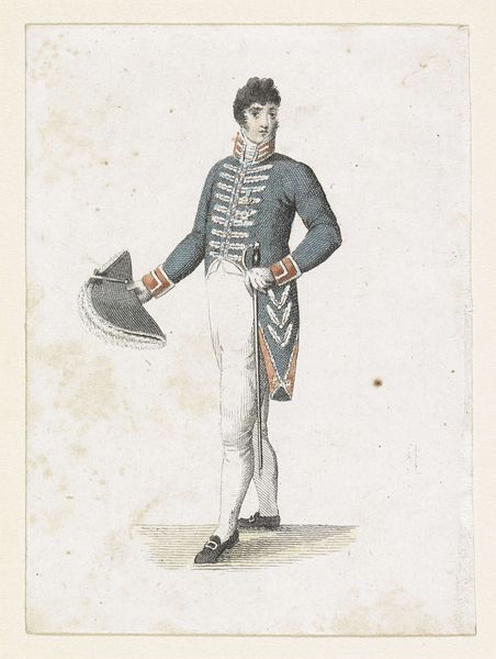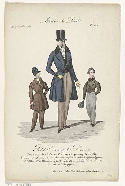 Curator: Here we have an engraving entitled "Petit Courrier des Dames, 30 septembre 1833, No. 1005 : Gilet satin à dessin…", created in 1833 by an anonymous artist. It depicts two elegantly dressed men in what seems to be Parisian fashion. What strikes you about it? Editor: The composition is really interesting; there's such a focus on male attire, presenting it with an almost theatrical elegance, which reflects the cultural obsession with masculinity and presentation. The scale also appears exaggerated, which makes me question its relationship to societal expectations of gender. Curator: Precisely! Fashion plates such as this weren't merely about clothes; they were visual articulations of social standing and aspirations. Romanticism emphasized individual expression but within the strict confines of class. The gilet mentioned in the title, “satin à dessin,” indicates an opulent textile meant to convey refinement. Editor: I'm drawn to the waistcoat. The botanical motif is very strong, calling to mind symbols of nature, youth, and the pastoral idealized by Romanticism, while also alluding to aristocratic aesthetics, hunting parties, and leisure. But I find that there are rigid forms suggesting an attempt to constrain or dominate natural vitality. Curator: A fascinating read! That juxtaposition speaks to the era's complex relationship with progress and tradition. The artist has chosen to highlight minute details. Who does this style of dress allow to perform within social settings and what are their accepted freedoms within those constraints? Editor: Considering your point, notice how one man faces forward, almost as an exhibit, and the other is turned away. What narrative do you suspect that anonymity performs? Curator: It potentially embodies the conflicting desires to participate and yet resist the male gaze— a form of defiance. Though mass-produced fashion plates reinforced existing social structures, some could be reclaimed, adapted, or rejected to fit evolving identities. The choice not to feature the wearer indicates the rise of individual taste. Editor: This piece isn't simply documenting garments; it serves as a reminder that the choices we make carry the weight of inherited symbolism. There are endless meanings!