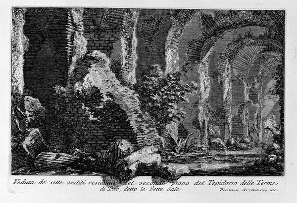 Editor: Here we have Giovanni Battista Piranesi’s 1756 engraving, "The Roman antiquities, t. 1, Plate XXIII. Aventine Hill." I’m immediately struck by the stark contrast between the detailed architectural ruins and the rather dramatic sky. It feels very theatrical, almost staged. What do you see in this piece? Curator: I find myself drawn to the complex interplay of line and form. Notice how Piranesi uses hatching and cross-hatching to create depth and texture, particularly in the rendering of the ancient structures. The sharp lines delineate the architectural forms with precision. However, consider how this precision serves to enhance the visual weight of certain elements, drawing the eye to specific areas of the composition. Do you find that there are particular areas where the lines become more or less dense? Editor: Yes, absolutely. The lines are much denser in the foreground ruins, which makes them appear heavier and more imposing than the structures in the distance, contributing to that sense of depth you mentioned. So, it's not just about representing the scene, but manipulating it with technique? Curator: Precisely. Piranesi masterfully uses the materiality of the engraving to dictate our experience. The stark contrast and density variation invite a semiotic reading, don't you think? Editor: I think so! He is playing with the idea of ruins. He builds, quite literally through his detailed artistic practice, a sense of lost history and awe. It’s pretty amazing to see how just line work can accomplish that. Curator: Agreed. It shows us how art is fundamentally about using form and the elements of art to manipulate our experience and understanding.