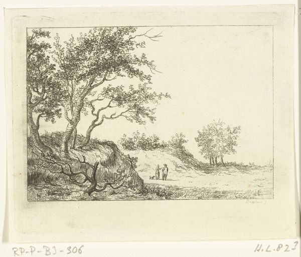 Curator: Welcome. We're standing before Ernst Willem Jan Bagelaar's "Landscape with Two Cows Lying Down." The work dates sometime between 1798 and 1837, and is rendered in ink and pencil, using etching to enhance detail. Editor: The immediate feeling is tranquility. It’s this pastoral scene etched with such a light hand that it almost floats. You know, those cows are just part of the whole; very grounded in their materiality. Curator: Precisely! These pastoral scenes reflected a cultural desire, especially amongst the merchant class, to connect with nature. The cow, a common symbol of domesticity and prosperity, roots us in tangible elements, an idealized Holland. What does it tell us about that historical yearning? Editor: For me, the ink and etching are fascinating because you can see the craft involved, but you are completely separated from nature by the artistic and industrial processes that went into this artwork, all of which takes time. The accessibility of prints allowed broader audiences to consume the image of idyllic country life even amidst urban expansion, highlighting complex ties between materials and consumption. Curator: The choice to depict this scene in monochrome also emphasizes an underlying purity, or at least the *idea* of purity and authenticity. Think of the enduring cultural trope of pastoral life as one far from modernity. Bagelaar isn’t just capturing what's in front of him. He's constructing and presenting a carefully idealized landscape. The boats in the background subtly nod toward commerce, though; that the ideal pastoral life can only be afforded through the mechanisms of the contemporary present. Editor: Right, even what seems like a “natural” or idealized scene can’t escape its material roots, the labour required, even the subtle message about class at play. The paper it’s printed on has its own story; where was that made, by whom, and how accessible would these things have been? Curator: And isn’t that layering what keeps us engaged? It's the quiet drama of symbolic meaning coexisting alongside, yet being shaped by, tangible production and social history. Editor: Agreed. There’s something powerful in that tension.