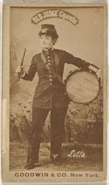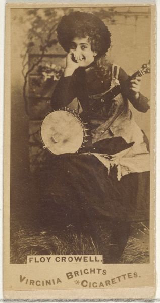 This is a photograph of Floy Crowell, part of the Actors and Actresses series, produced by Allen & Ginter for Virginia Brights Cigarettes. The sepia tone gives a nostalgic and antique feel to the image, emphasizing its historical context. Crowell is shown in costume with a banjo; the composition and lighting seem designed to create a sense of authenticity. The combination of theatrical elements—her costume, the prop of a banjo, and stage-like setting—with the commercial function of advertising, raises interesting questions. Is the goal to elevate the cigarette brand through association with the artistry of the stage? Or does it commodify artistic talent, reducing Crowell to a mere symbol for consumption? The ambiguity of the photograph lies in its dual role as a promotional tool and a representation of cultural figures. It invites us to consider how the image functions within a system of signs. While seemingly straightforward, its historical and cultural context adds layers of interpretation, questioning the relationships between commerce, art, and identity.