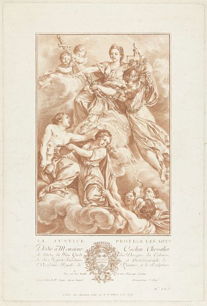 Curator: Gérard Audran's print, "Venus Demands of Vulcan the Arms which he has Forged for Aeneas," presents a fascinating scene. I'm struck by the stark contrast between the figures; Venus floating ethereally versus Vulcan hunched over, laboring. Editor: And what a powerful visual metaphor that embodies. Venus's request transforms the labor of crafting armor into a symbolic act of divine intervention and protection. Look at the implements cast on the floor. Curator: Exactly. The material production of these arms transcends mere craft. It becomes integral to the narrative, echoing the significance of skilled labor within the context of divine will and heroic destiny. Editor: For me, the image evokes a timeless narrative of divine request and skilled labor. Venus is portrayed as an ethereal being, demanding Vulcan's craft in service of Aeneas. The helmet, shield, and other pieces symbolize the protection Aeneas will need. Curator: The divine request and Vulcan's toil are linked through the material products. It's a story of how objects gain layers of meaning. Editor: Seeing this image, the interplay of divine request, human skill, and symbolic weight resonates profoundly. Curator: Indeed, a compelling glimpse into the intersection of production, divinity, and myth.