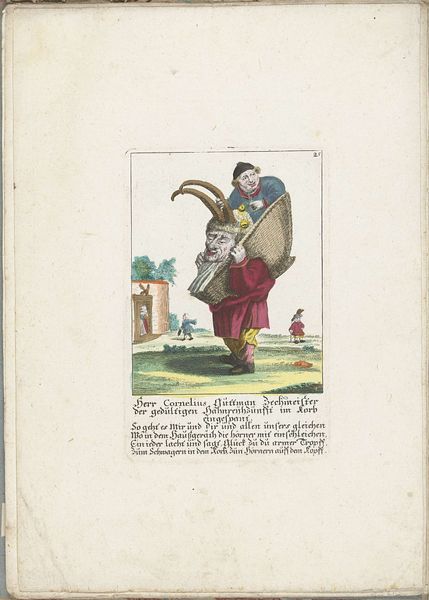 Curator: Let’s discuss this fascinating piece from around 1710. It's titled "De dwerg Piperouk als directeur van een tabakscompagnie," or “The Dwarf Piperouk as Director of a Tobacco Company.” The work is attributed to Martin Engelbrecht. It combines watercolor and coloured pencil, depicting, as the title suggests, a dwarf. Editor: The first word that comes to mind is “grotesque.” It’s immediately striking, this caricature. He dominates the scene with a posture that suggests power and disregard for the viewer. What can you tell me about its historical significance? Curator: Caricatures were extremely popular as satirical commentary. Dwarfs in the 17th and 18th centuries were often symbolic figures – seen as wise, grotesque jesters, even omens or figures of mockery. Note his clothing; a flamboyant sleeping cap, an elaborate smoking pipe. These items would’ve carried strong connotations at the time. Editor: Exactly! This connects so directly to issues of class and commerce of the period. Engelbrecht, through Piperouk, critiques the Dutch tobacco trade’s elite figures. The image reveals power dynamics—the smallness implying moral shortcomings within commercial society, perhaps literally diminishing their importance. The smoke billowing from his pipe visually connects his image and that era’s booming industry of Virginian and Brazilian Tobacco. Curator: Indeed, notice the small figures in the background seemingly in awe, reinforcing Piperouk's assumed position. The vibrant colouring also heightens the character’s absurdity, intensifying its satirical thrust. Even now, its visual elements remain striking; the artist plays into conventional symbols to mock authority and opulence. Editor: And what a statement on the social ramifications! In this sense, Engelbrecht creates space to unpack critical commentary surrounding both early capitalism and colonialism's devastating, long-lasting effects through art history. What’s been unveiled today only deepens this portrait’s unsettling social dimension and lasting relevance. Curator: A clever piece—one filled with layers of complex symbols. Thank you for drawing out more of its resonance!