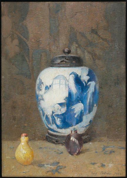 Editor: Today, we're looking at William Merritt Chase's "Still Life with Flowers," created in 1883. I am immediately drawn to how soft and dreamlike this oil painting feels; almost like a faded memory of a beautiful floral arrangement. The texture also looks really interesting with the impasto visible. What stands out to you in this piece? Curator: Oh, that soft, dreamlike quality – you nailed it! For me, it's like stepping back in time to a cozy, slightly cluttered artist's studio. Chase was brilliant at capturing those intimate, everyday moments. You mentioned the impasto. Notice how the thickly applied paint almost gives the flowers a tactile presence? It’s as if you could reach out and touch them, smell their perfume...even though they're painted with such loose, impressionistic strokes. And the subdued palette - what do you make of that? Editor: It's interesting that you bring up the palette because to me, the limited colors are both soothing and intriguing! The muted tones make it hard to read the composition sometimes, but there's still such an elegant presence here. Curator: Exactly! And that's Chase's genius. He doesn't overwhelm you with detail. Instead, he teases you with glimpses, shadows, and suggestions. The painting becomes less about accurately depicting flowers, and more about capturing a feeling, a fleeting impression of beauty. Did you notice the Asian influences in the vase? Editor: Yes! That vase almost feels like it holds the key to another culture. Curator: Absolutely. And I believe you see, with a gentle heart, what a wonder the piece is! It invites us to pause, to appreciate the beauty in the ordinary, and to find joy in the quiet moments. Editor: I hadn't really considered all of those details. Thanks for providing some depth to my initial reaction. Curator: Anytime!