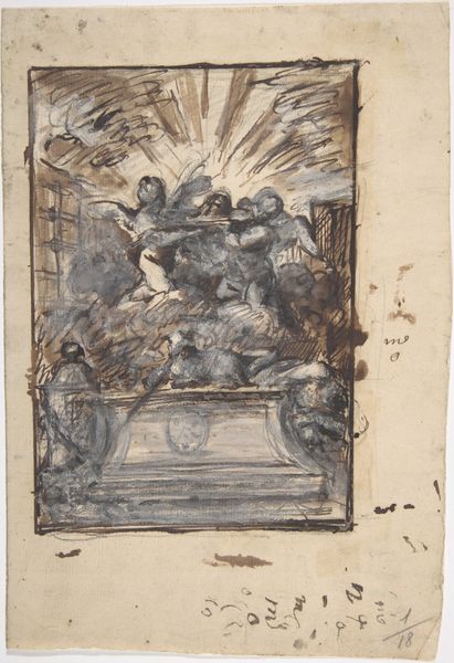 Curator: Here we have a sketch by Reuben Townroe, an artist who lived from 1835 to 1911. It’s a study, really, for what looks like a frieze – all pencil and watercolor. Editor: The figures strike me as oddly frozen, even for a preliminary sketch. There’s a stillness, a gravity that hints at something monumental. Curator: Yes, it’s all very classical, isn’t it? The drapery, the architectural setting… Townroe was clearly steeped in the visual language of antiquity. The use of these figures swathed in fabric, a timeless motif of human representation. Editor: The incomplete scaffolding suggests this is a work in progress, an insight into the artist's process. It makes me think about how we continuously rebuild and reinterpret the stories of the past. Curator: I suppose that's what makes this sketch so compelling—it reveals that constant tension between the ephemeral and the eternal. Editor: It’s a good reminder that art is never really finished, is it?