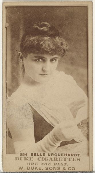 This is a portrait card of Olga Brandon, from the Actors and Actresses series, created by Allen & Ginter. The subdued sepia tones create a visual field that emphasizes the texture and form over vibrant color. The composition focuses on Brandon's face and elaborate hairstyle. Notice how her gaze is directed slightly downward, lending the image a sense of introspection. Semiotically, this can be read as a sign of the actor's inner life, a glimpse beyond the performative facade. The lines of her hair and dress, though soft, frame her face, drawing our attention to the subtle play of light and shadow that models her features. Consider how this card, designed as a collectible insert for cigarette packs, functions as a signifier of both celebrity and consumerism. The formal construction—the careful arrangement of light, line, and form—elevates the actress's image, transforming it into a commodity circulated within a burgeoning culture of mass media and celebrity worship. The card's material presence, its tactile quality, reminds us of art's embeddedness within broader economic and cultural systems.