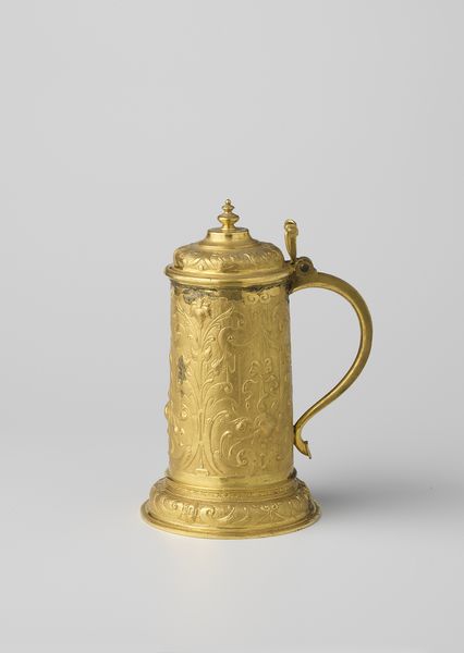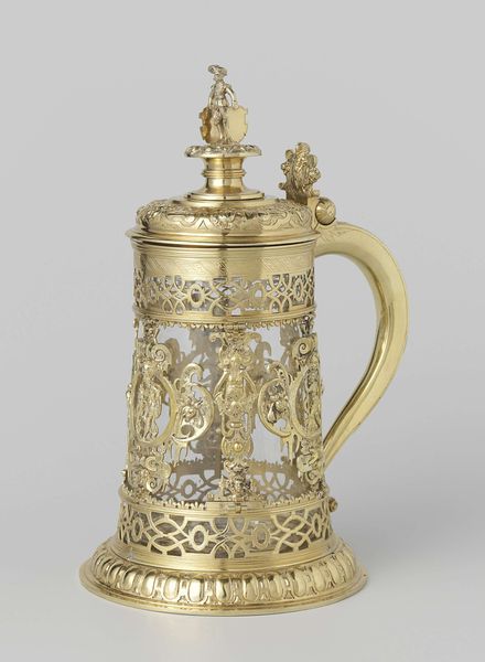 Editor: Here we have a galvanoplastic reproduction of a drinking jug with a lid, depicting mythological figures; it was made before 1880 by Elkington and Co. in bronze and other metals. I’m struck by the richness of its ornamentation and the implied narratives it holds. How do you interpret this work? Curator: It's tempting to see this as a straightforward example of Baroque revivalism, but I think it's important to interrogate its context. These elaborate metalworks were often part of displays of wealth and power, especially during periods of industrial expansion. Who was consuming these images of mythological power, and what social anxieties were being assuaged through them? What narratives are being reinforced, and perhaps more importantly, whose stories are excluded? Editor: That’s a great point! So, beyond the aesthetic appeal, we should consider the power dynamics at play in its creation and consumption. It is quite literally decorative art. Does the choice of mythological scenes point to a deliberate construction of identity or lineage by its owner, connecting themselves to historical power? Curator: Precisely. Consider the appropriation of classical imagery in the service of constructing national identity. The figures, likely referencing Greco-Roman narratives, speak to the enduring influence of classical ideals on Western European identity, but selectively. How might this "revival" also serve to legitimize colonial ventures, drawing parallels between their own empires and those of the ancient world? And to whom was this visual language accessible? Editor: That’s a perspective I hadn't fully considered. So, it's not just about beauty; it's about understanding the object's role in reinforcing specific power structures. Thank you for opening my eyes to a new level of reading art objects! Curator: Art becomes far richer once we understand its ability to function within broader socio-political landscapes. It is vital that we understand artworks through their relationship to narratives of gender, race, and politics.