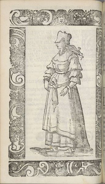 This image is a print by Christoph Krieger titled 'Spagnuola nobile alle feste' made with the woodcut technique. Its formal arrangement, with the central figure framed by decorative borders, presents a stark contrast between figuration and ornament. The artist uses line and texture to define the contours and patterns of the noblewoman’s dress, creating a play of light and shadow that articulates the subject’s social status. Note how the ornamental frame both contains and enhances the figure, reinforcing a visual hierarchy. The strategic use of hatching and cross-hatching techniques adds depth and volume, giving the image a tactile quality. The image evokes semiotic codes related to fashion, identity and power. Through the figure’s attire and posture, the artist conveys a sense of nobility and cultural identity, inviting viewers to decode these visual signs within the context of their own knowledge. This image operates as a cultural artifact reflecting artistic styles and social structures of its time.