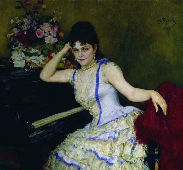 Editor: This is Raimundo de Madrazo’s, "Reverie, The Letter," painted around the 1870s. It’s an oil painting, and there's a melancholy feel to it, mostly driven by the lone figure contemplating what appears to be a letter. How do you interpret this work, looking at its formal elements? Curator: Well, let us examine the composition first. Note how the artist uses a predominantly vertical format, echoing the standing figure, contributing to a sense of formality. The arrangement of objects—the piano, flowers, letter—create lines which lead the eye back to the face, the true locus of attention. Editor: I see what you mean. The light seems very deliberate, too, drawing attention to her face and gown. Curator: Precisely. Madrazo’s rendering of light and shadow are masterful; observe how the play of light on the dress material is rendered with what can be understood as a painterly emphasis. Color functions here less for realism and more for mood, don't you agree? Editor: I do. It's interesting how the muted pink background contrasts with the brilliance of the white dress and yellow shawl. This contrast makes them stand out so strongly against the ground of soft focus pink in the background. Curator: The brushwork also requires our attention. Madrazo’s loose, almost impressionistic, strokes give a liveliness to the fabrics. The lines have their own kind of agency that suggests the transient emotional states represented by the depicted sitter. Do you perceive an emotional dynamic created through this opposition between surface and volume? Editor: Definitely. Focusing on those techniques reveals a depth of feeling that might be missed at first glance. This close look really enhanced my understanding of how it’s constructed to produce a strong sense of wistful reflection. Curator: Indeed. Looking closer always helps appreciate the layers of complexity inherent to an image, its composition, the textures, color interplay, creating new readings for the observer.