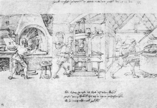 Editor: So, this is Valentine Hugo's "Cadavre Exquis," or "Exquisite Corpse," from 1932. It's an ink and colored pencil drawing on paper, and the longer I look, the more dreamlike it feels. Almost like peering into someone's subconscious. What symbols strike you in this work? Curator: The immediate symbol that grips me is the train receding into the distance. The train in Surrealist iconography often symbolizes the movement of the unconscious, the journey inward. It suggests both freedom and an irrevocable departure from reality. But then, do the glasses attached to the table legs by liquid pillars, suggest stability through something that seems like it should be inherently unstable? Editor: That's interesting! I hadn't considered the glasses as points of stability, but more as bizarre structural supports. The train could suggest societal progress versus the static and strange table set below. Is there a dialogue between both ideas here? Curator: Indeed. There is a distinct visual and perhaps psychological layering occurring. What is progressing further away, up and to the horizon of awareness, contrasts sharply with that which props the concrete, grounded 'reality.' Also, the crowd. What do we remember of crowds, how do they tend to form and inform individual perspectives in times of upheaval and anxiety? Editor: Now that you mention the crowd, its strange unity and presence feels foreboding given what would happen a few years later in Europe with the war. Maybe, there is cultural memory encoded in there? Thank you so much for that insight. Curator: The pleasure is mine. Always consider the long lives of our symbols! The "Cadavre Exquis" technique allows a cultural stream of unconscious thought and feeling to surface in uncanny and important ways.