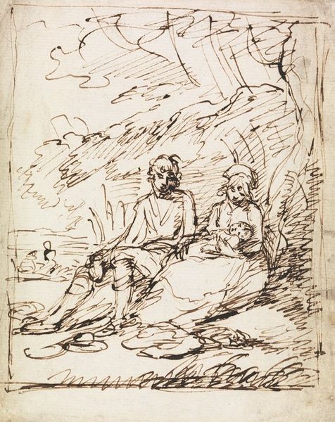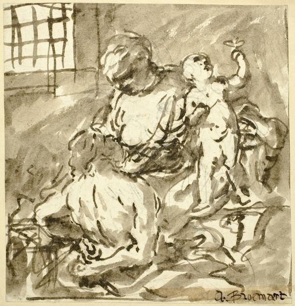 Curator: Here we have Luca Cambiaso’s “Venus and Cupid,” a pen and brown ink drawing in the Harvard Art Museums’ collection. Editor: It's striking, this quick, almost frenetic sketch. There’s a raw intimacy in the figures' embrace, but something about the harsh lines feels almost violent. Curator: Cambiaso was known for his rapid, economical style. The cross-hatching creates volume and shadow, typical of his work. Editor: But consider the power dynamics at play. Venus, the goddess, holding Cupid, her son, almost restraining him. It hints at the complexities of love and desire within a patriarchal framework. Curator: It reflects the artistic conventions of its time, exploring classical mythology. Editor: Indeed, but perhaps also revealing the tensions inherent in representing these subjects. Curator: A fascinating glimpse into artistic practice and societal norms. Editor: Absolutely, a potent reminder that even classical themes carry the weight of their historical context.