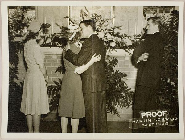 Curator: Here we see "Feels Sure: Teamsters Union Vice President James Riddle Hoffa," snapped by United Press during a convention in Miami Beach. The black and white really amplifies the almost vaudevillian quality of the scene, doesn’t it? Editor: It does! The hats are wild. They look like car parts! What was Hoffa like? Curator: Larger than life, and about as subtle as a speeding truck. This photo captures that ambition, that "I’ve got this" confidence, just before things got, shall we say, complicated. Look at the supporters’ faces - do you see blind faith or skepticism? Editor: Good question! I see both. He looks pretty pleased in any case. Curator: It's a fascinating glimpse into a very particular moment in American history, a moment filled with hope and hubris, isn't it? Editor: Definitely a lot more going on here than I first thought.