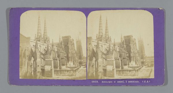 Curator: This stereo photograph, taken by Jean Andrieu between 1862 and 1876, presents the facade of the Basilique Saint-Michel in Bordeaux. The monochrome image is striking, isn't it? Editor: It is! It immediately makes me think about preservation and the work involved in keeping historical buildings standing. The basilica looks like it's undergoing repairs; note the scaffolding obscuring some of the architectural details. It introduces a gritty, workaday reality into a monumental and historically rich structure. Curator: Absolutely. The basilica itself represents centuries of craftsmanship and devotion. The Romanesque architecture, which the label tells us, suggests that materials such as local stone would have been quarried and then transported to this site and processed by the hands of many, many artisans over decades. Editor: And the decision to document this specific facade under those conditions reveals so much about the relationship between institutions and the public's perception of architectural heritage. Was there an attempt to showcase its state or an ongoing civic project through distribution? Was the repair an embarrassment to civic leaders? This photograph then operates on two levels, as a historical record of an architectural style and a documentation of social values in that time period. Curator: Yes! We also cannot ignore the photograph itself as a commodity. Stereo photography was a popular form of entertainment; viewers would purchase them and view the scene in 3D through a special viewer. It raises the question: Was it just for aesthetics or for promotion purposes as postcards do today? Was this photograph acting as propaganda for a restored historical space? The layers are quite intriguing! Editor: Definitely food for thought. It underscores how images can serve as powerful tools in shaping collective memory and celebrating a place through art or, in this case, architecture. Curator: Ultimately, I believe it reminds us to reconsider that photographs like this are also commodities made from complex manufacturing processes with its own intricate labor processes and complex circulation networks in consumer societies. Editor: Well said! A seemingly straightforward image that’s pregnant with nuanced details regarding artistry, labour, socio-political forces and production.