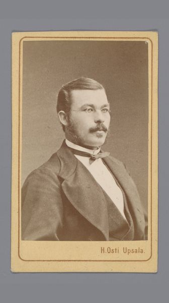 Curator: Here we have "Portrait of an Unknown Man" a photograph produced sometime between 1867 and 1880 by Eurenius & Quist. The image utilizes the albumen print process which was quite popular at the time. Editor: There's a stark formality to this image. The man's expression is carefully neutral, but I sense a vulnerability beneath the surface. He looks trapped by the conventions of his time. Curator: Albumen prints offered a high level of detail for the time, capturing the textures of his clothing and even the subtle shadows on his face. These portraits served a purpose—to project an image of respectability and status during the burgeoning middle class era. Editor: Exactly! The portrait becomes a site of constructed identity. The suit, the carefully groomed mustache...these aren't just details, but signifiers of power and belonging, masking potentially diverse personal experiences within a homogenizing social mold. The composition feels deliberate in maintaining these visual cues to express the sitter's perceived social role. Curator: It's interesting to consider the agency of the sitter here. Did he actively participate in the construction of this image, or was he simply conforming to societal expectations dictated by class and gender? What kind of exchanges took place in Eurenius & Quist’s studio to get to the final image? Editor: The ‘unknown man’ label becomes more poignant. It begs the question of what stories are lost when individuals are only defined by their adherence to prevailing societal standards and modes of representation? What radical or dissenting expressions got flattened in such portraits? Curator: This piece reminds us that even seemingly straightforward images are products of specific historical and cultural circumstances. The details matter, in pointing towards those forces. Editor: Agreed. Analyzing it reminds us how art and identity constantly intersect and push against rigid social structures. I can't help but wonder, what would our "unknown man" have wanted us to truly see?