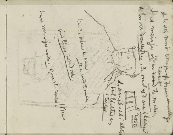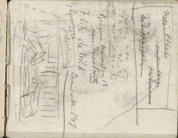 Editor: Here we have George Clausen's "Kledingstukken voor het bovenlijf voor vrouwen" created around 1875 using pencil on paper. It feels like a page torn straight from a sketchpad. All the scribbled text makes it resemble a collection of fashion notes. What compositional elements stand out to you the most? Curator: The seeming randomness is, in fact, carefully calibrated. Note the juxtaposition of textual annotations alongside gestural outlines. Observe how the artist balances positive and negative space, allowing the eye to dance across the surface. Consider also the interplay between the precision of the handwritten text and the suggestive nature of the garment forms. Editor: I hadn't considered that juxtaposition so deliberately. How does the medium, pencil on paper, contribute to the overall effect? Curator: The medium's inherent delicacy underscores the ephemeral nature of fashion itself. Pencil lends itself to quick notation and correction, fitting seamlessly with the immediacy one expects in preliminary sketches. The limited tonal range concentrates visual focus on the outlines and arrangements, eschewing detail. The absence of bold contrast directs the viewer to attend primarily to the underlying forms rather than illusionistic effects. Editor: So it's the absence of traditional painterly techniques that helps us understand the subject matter? Curator: Precisely. The raw quality emphasizes an art attuned more to the structural design than descriptive detailing. The pencil markings offer insight into the conceptual blueprint before realization into garment. Editor: I'm definitely looking at it differently now. Thanks! Curator: The drawing functions effectively because the marks and shapes create a totality which supersedes reference to representation. Thank you for engaging this dialogue with intention.