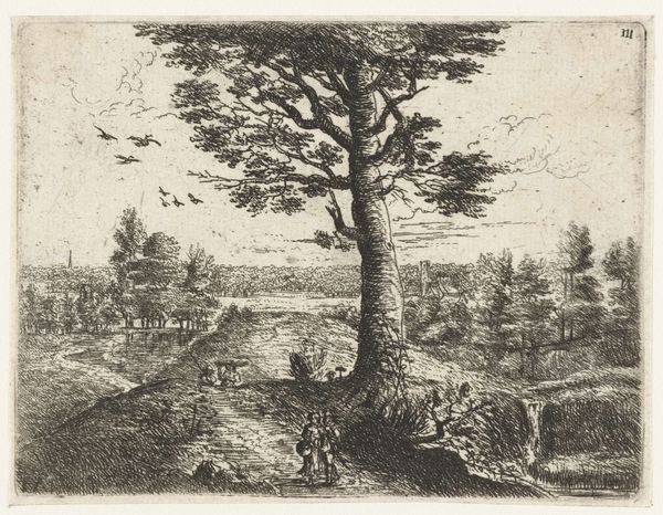 Roelant Roghman made this print entitled 'View Near Kampen' using etching in the 17th-century Netherlands, a period known as the Dutch Golden Age. Here, a serene landscape speaks to the Dutch Republic's evolving sense of national identity. Note how the scene emphasizes the common features of the Dutch countryside - the waterways, modest buildings, and open skies. Roghman presents a vision of a harmonious relationship between the Dutch and their environment. This image belongs to a larger series that captures the varied faces of Dutch villages. The series may have served to document local landmarks, but it also reflects the political and social values of the time. It represents a culture of civic pride, emphasizing the beauty and order of the Dutch Republic. Historians consult a range of resources, from municipal records and cartographic surveys to understand the relationship between art and society. Through such research, art reveals itself as contingent on its social and institutional contexts.