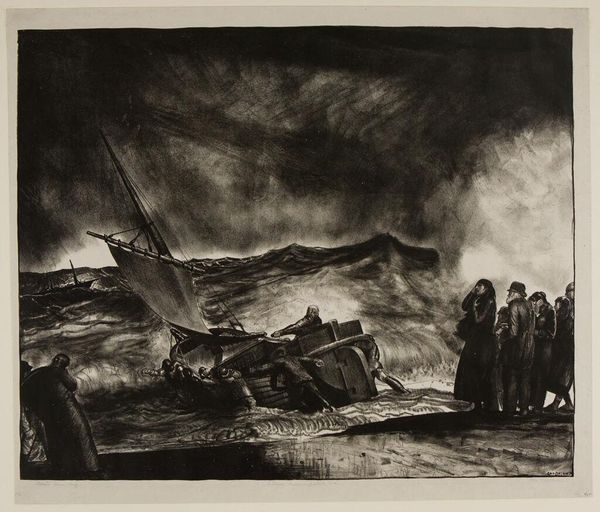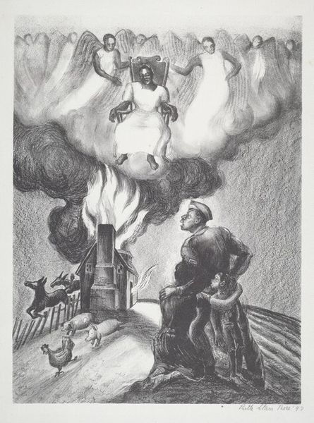 Fritz Eichenberg's print shows a landscape dominated by a prominent three-barred cross under a turbulent sky. The cross is a potent symbol, deeply rooted in religious iconography, representing faith, sacrifice, and salvation. This three-barred cross, often associated with Eastern Christianity, also calls to mind ancient symbols of power, like the scepters of rulers, or even earlier, the totemic symbols of tribes seeking divine protection. The figure cowering near the cross evokes images of supplicants seeking solace amidst turmoil. This act of seeking refuge under a cross mirrors gestures seen throughout history, from medieval depictions of saints sheltering the faithful to ancient rituals invoking divine protection. The emotional weight of the image lies in this tension: the looming, ominous sky set against the enduring symbol of hope. It is a scene charged with a plea for deliverance, a visual echo of humanity's timeless struggle against the forces of adversity. This symbol resurfaces through history, evolving, adapting, yet always retaining its primal resonance.
