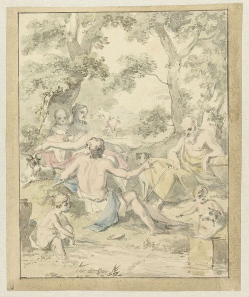 Jacob de Wit created this drawing of Jupiter and Mnemosyne using pen, brown ink, and gray wash, with watercolor, at an unknown date. The drawing is dominated by its delicate, almost ethereal quality, achieved through the layering of translucent washes and the fine, calligraphic lines that define the figures and landscape. These visual aspects evoke a sense of classical grace and mythological wonder. De Wit masterfully uses line and wash to create depth and volume, giving the figures a sculptural presence. The composition, with its balance between the earthly and the celestial—represented by the cherubic figures above—invites a semiotic reading of divine and mortal realms. The artist's technique also reflects broader artistic concerns of the period, particularly the Rococo interest in lightness, movement, and decorative elegance. The drawing invites a continuous process of interpretation, where viewers engage with the interplay of form, content, and historical context, recognizing that art is a dynamic site of meaning-making.