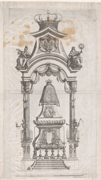 Editor: Here we have a photo reproduction of a print, "The Chapel of Grace with the Image of the Black Madonna in the Einsiedeln Abbey," created sometime between 1854 and 1880 by Charles and Nicholas Benziger. It’s sepia-toned and looks so fragile. What’s your take on this piece? Curator: Fragile, yes, almost like a whispered prayer caught on paper. What grabs me is how the artists created a sense of ethereal luminescence, all those radiant lines emanating from the Madonna. It's an intimate peek into a sacred space, wouldn’t you agree? The Black Madonna, especially, has always been such a fascinating figure of resilience. Ever wondered why "black"? Editor: I suppose it could be a reference to the original materials. Maybe a commentary on...oppression? What's the symbolic purpose behind this specific location or the architectural construction surrounding the icon? Curator: Precisely! The Abbey at Einsiedeln was a major pilgrimage site, kind of a spiritual haven. This print cleverly reproduces not just the image of the Madonna, but the whole *experience* of encountering her in that hallowed space. The frame feels solid and strong, reflecting our material world, against the divine that seems almost to float in front of it, what do you make of that opposition? Editor: It brings a really important contrast to mind. How we approach and conceptualize divinity in our material world, through our art. Curator: Absolutely! And that romantic touch – that delicate line work combined with an aura of mystery, pulls us right into a space for quiet contemplation, wouldn't you say? It is more of an offering of belief. Editor: I agree. I was caught up on the symbolism alone at first. Now I am noticing how the style and artistic techniques emphasize the feeling the piece invokes, as well.