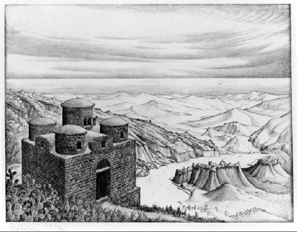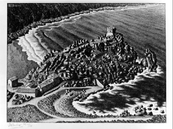 This is Escher’s ‘Morano Calabria’, a wood engraving. I'm really drawn to Escher’s graphic sensibility here. Look at the way he constructs a sense of depth with just black and white. It’s all about the process of carving, the repetitive mark-making giving texture and structure to the landscape. The horizontality of the mountains in the background is mirrored in the valley. But it’s the houses on the hillside that really grab me, they’re almost like geometric shapes, so precise and yet nestled together haphazardly. Notice the little lines that denote the rooftops and suggest the shadows. The texture is incredible; each carved line feels deliberate and impactful. Escher’s work is sometimes seen as a precursor to op art, but it has a depth and intricacy which is all his own. It reminds me a little of Piranesi, the architect and engraver, who also played with perspective in a similar way.