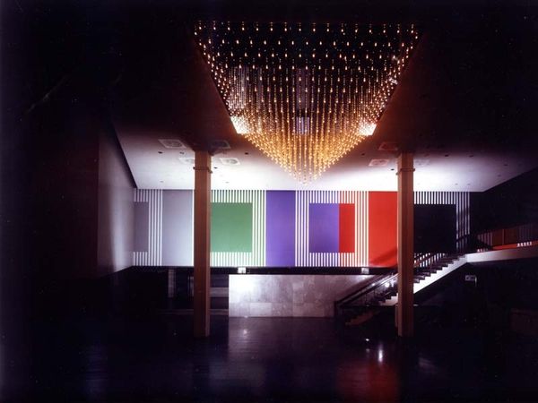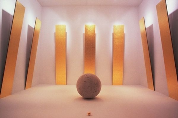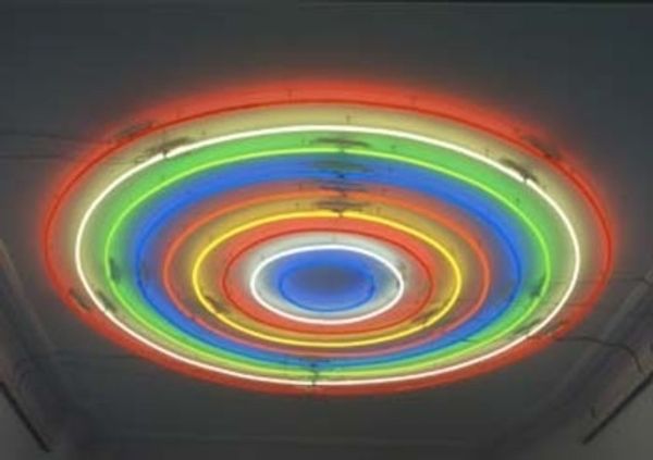 Curator: Here we see Dan Flavin’s "Untitled (to Tracy, to celebrate the love of a lifetime)", a light installation from 1992. Editor: It’s a dreamy kind of space, isn't it? The colors create this luminous glow, transforming the architecture itself. Curator: Flavin frequently intervened within specific architectures; here he uses commercially available fluorescent tubes to articulate and transform space. There is nothing hidden. It is almost aggressively artificial. Editor: And the very directness has power. I wonder, what does it mean to publicly dedicate such a stark, minimalist work to a love that’s supposed to be a "lifetime"? How might a more intersectional lens expand our consideration of his work, and the cultural politics of artistic expression? Curator: Flavin engaged deeply with art history. You might look at its connections to the readymades of Duchamp or its roots in Russian Constructivism and the Bauhaus school. The way it fills a space challenges our conventional expectations of what sculpture might be, shifting it from object to experience. Editor: True, but who has access to these experiences and spaces is worth exploring too. This was made during a pivotal era, at the intersection of queer activism and the AIDS crisis; this lends the title and the work even deeper resonance. It acts as a spectral monument. The ephemerality of light underscores the fragility of life and love, and how radical visibility impacts cultural understanding of queer love. Curator: Well, his legacy lives on. It remains an important influence, inspiring dialogue, not just on what art is, but its capacity for impact. Editor: It calls on the responsibility of galleries, museums, and critics to include historical and theoretical insights when engaging with Flavin’s, and really any, work. Thank you for illuminating the depths and the complexities of his creation. Curator: My pleasure.