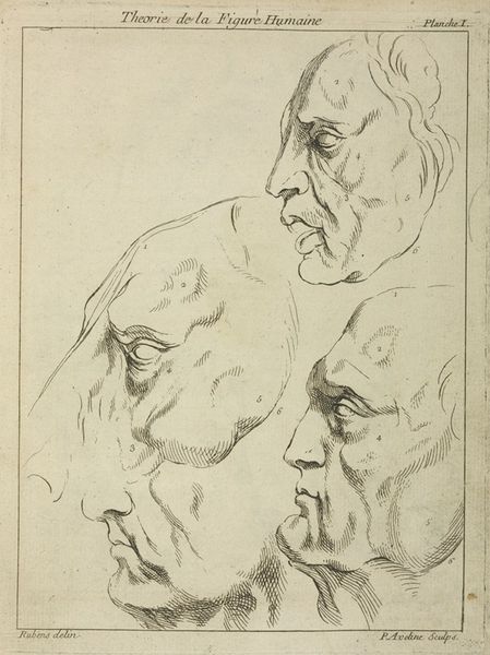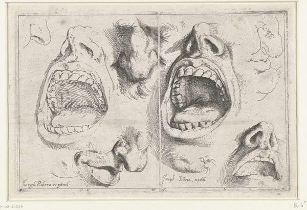 Editor: Ribera's "Studies of the Nose and Mouth," created sometime in the 17th century, offers a rather intense focus on isolated facial features. The stark contrast and anatomical detail are striking. What do you see when you look at this print? Curator: Observe how Ribera employs line to define form and texture. The hatching and cross-hatching create a sense of depth, particularly within the open mouth. Notice how the artist uses the linear structure to convey the tension and volume of the facial muscles. Editor: So, the emphasis is on the technique itself, rather than the subject's emotional state? Curator: Precisely. It's the formal arrangement and the deployment of line that command our attention, showcasing Ribera's mastery of the etching process. Consider how the varying densities of line work establish tonal variation. Editor: That makes sense. I was initially caught up in the slightly grotesque imagery, but focusing on the line work reveals a different level of artistry. Curator: Indeed. It invites us to analyze the fundamental visual elements, to understand how the artist's choices shape our perception.