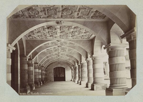 Editor: This is a photograph called "Zuilengalerij in het stadhuis van La Rochelle," taken sometime between 1880 and 1900 by Médéric Mieusement. It's currently at the Rijksmuseum. I'm immediately struck by the rigid geometry and repetition, almost a study in forms. What elements stand out to you? Curator: Note how the composition is governed by a relentless series of vertical and horizontal lines. The fluted columns, each segmented, establish a rhythm. Observe how the archways mirror this, softening the harshness with their curves. Ask yourself, how does this interplay of straight and curved lines affect the overall feeling? Editor: It does feel like a very controlled space, but I'm curious about why the photograph focuses so intensely on these architectural features. What can we learn from the relationships between them? Curator: Precisely. Consider the negative space. How does the photographer utilize it to define the columns and arches? Note also the quality of light, the chiaroscuro effect created by the sun filtering through the gallery. Light isn't just illumination here; it's a structural component, sculpting the forms. The symmetry of the archways contrast to the depth they produce from light. Editor: That's a good point – the way the light interacts with the columns gives them depth and volume. Now I’m wondering about the ornamentation… Curator: And rightly so! Observe the carved details above the arches. These are not merely decorative flourishes. They are integral to the overall design. Consider the texture, how it engages with the light differently from the smooth surfaces of the columns. It all works together in building relationships with one another. Editor: This has definitely given me a new appreciation for how all the elements work together. Curator: Indeed, through line, form, light, and texture, we decode the essence of the structure itself.