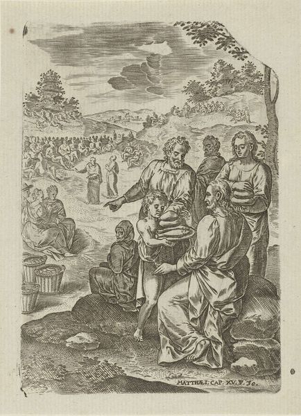 Curator: Here we have Pieter de Jode I’s “The Arrest of Christ,” a print held at the Rijksmuseum, and estimated to have been produced sometime between 1590 and 1632. The detail in this engraving is quite remarkable. Editor: It's arresting, literally. The dramatic staging, with that central illuminated figure, Christ, immediately draws the eye. The sheer volume of bodies surrounding him creates a palpable sense of entrapment. Curator: Yes, the way de Jode uses engraving allows for such intricate detailing, especially in the textures and the layering of figures. Think about the workshop practices; prints like these were often collaborative, involving specialized artisans. Editor: And the formal tension is magnificent. The swirling drapery of the figures, contrasted with the harsh lines of the weapons. The darkness of the wood juxtaposed with the lantern's stark glow creates drama. Compositionally, there’s something undeniably baroque in its dynamism. Curator: The means of production also reflect socio-political dimensions; the engraving process enabled the wide dissemination of religious imagery during a period of intense religious and political upheaval. These prints shaped the material culture and devotional practices of their time. Editor: Absolutely, and those diagonal thrusts across the frame propel the viewer’s eye and build the intensity of the moment— a truly exceptional arrangement. Curator: Seeing this image then tells us much about the systems of artistic creation, from material investment to distribution networks to modes of spectatorship in early modern Europe. Editor: A fascinating interplay of artistic elements creating an emotional tableau: from light and dark contrasts to lines and texture that contribute a strong message of dramatic arrest.