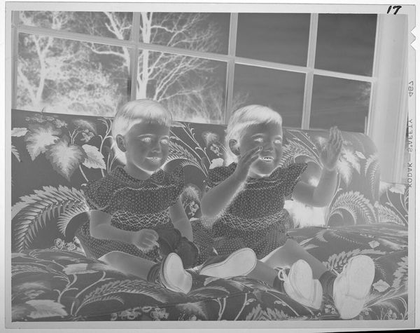 Curator: This intriguing image, taken by Lucian and Mary Brown, is simply titled "Untitled (two children with dolls on floral-printed couch)." The photo, small at just 5 by 4 inches, captures a moment of childhood stillness. Editor: My first impression is one of eerie quietude. The inverted tones give everything a spectral glow. It’s like a memory fading or a dream half-remembered. Curator: Absolutely. These photographic negatives, now part of the Harvard Art Museums collection, reveal how even domestic scenes become surreal under the gaze of the camera. Editor: The setting itself feels staged, almost theatrical. The floral couch, the window, the dolls—each detail contributes to this tableau of childhood innocence, but twisted. Curator: It’s interesting to think how the very act of photographing altered these children’s behavior, and our perception of them. It transformed an ordinary scene into something haunting. Editor: It's as though the image is a portal, inviting us to reconsider the boundaries between reality and imagination, presence and absence. A really compelling, uncanny photograph.