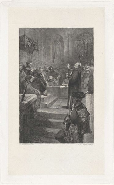 Editor: This drawing, “Music at the Metropolitan” by Betty Waldo Parish, done in pencil sometime between 1935 and 1943, has such an incredible sense of depth. It really pulls you into the scene, like you're standing right there amongst the crowd waiting for a performance to begin. What catches your eye in this piece? Curator: You know, the drawing breathes with the hum of anticipation, doesn't it? The air feels thick with unspoken expectations, a quiet prelude to the music about to flood the hall. But what truly fascinates me is Parish’s masterful use of light. It’s almost theatrical, wouldn't you say? The way the light glints off the architectural details, creating this wonderful play of shadows across the figures. Editor: Absolutely! The contrast between the light and dark areas is very effective at creating a sense of drama, don’t you think? Almost film noir-esque! Did this kind of urban scene carry particular weight during that period? Curator: In the Depression era, such glimpses into cultural life, especially renderings of public spaces filled with people seeking art and community, spoke volumes about resilience. Imagine seeing this drawing then, a stark yet comforting reminder of the beauty and shared humanity still thriving amidst hardship. What feelings stir within you as you consider that context? Editor: It’s incredibly poignant, really. I hadn’t thought about the escapism this scene might have offered during the Depression. This pencil sketch carries more significance than I initially recognized. Curator: Art, you see, isn’t just what you look *at,* but what it makes you see *within.* Editor: Definitely food for thought – I will keep this in mind next time.