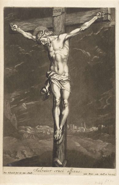 Editor: Here we have El Greco's "Christ on the Cross," painted in 1587, using oil paint. The contrast between light and shadow really strikes me; it gives the whole scene a very dramatic and somber mood. How do you interpret this work? Curator: Indeed, El Greco uses chiaroscuro masterfully, pulling Christ's figure forward. Notice how the landscape is just barely visible, a potential stand-in for Golgotha. Have you considered what the obscurity and drama of this landscape represents alongside the radiant figure of Christ? The light emphasizes the sacrifice but it also implies that something new and redemptive is also occuring; do you see it too? Editor: I hadn't really thought about it that way. So the darkness isn't just about the sadness of the event, it also symbolizes, perhaps, the old order passing away? Curator: Precisely! And what do we find placed at the top of this cross, which is meant to mark the identy of this Jesus? It becomes an assertion of kingship, a profound, and provocative act, repeated countless times in both private devotion and public declaration through religious imagery. Its enduring power shows cultural memory embedded within symbols. Editor: So, it's a loaded image then, with so much cultural history bound within this tragic but somehow triumphant picture? Curator: Exactly. And the emotional resonance of this image lies in its ability to collapse time, allowing viewers across centuries to engage with both the historical event and its enduring symbolic weight, don't you think? It makes one wonder what visual symbolism endures to our present moment. Editor: This has really changed my view on El Greco. I initially just saw a sad image, but now I recognize its layered symbolism and powerful cultural implications. Thanks for shedding light on that!