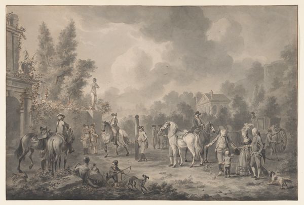 Curator: Here we have “The Surrender at Tönningen,” an engraving by Georg Haas, completed sometime between 1790 and 1794. The artwork captures a historical moment, specifically, the capitulation of Tönningen to Frederick IV of Denmark. Editor: Immediately, I am struck by the detail! I mean, it's all lines, delicate, almost fragile, but depicting something rather decisive. Everyone frozen in a stately surrender dance. A melancholic symphony. Curator: Exactly. This piece exemplifies history painting as printmaking served a vital public function, spreading awareness and reinforcing state narratives. Look closely. Can you spot elements intended to legitimize power? Editor: Sure! There is the posture of Frederick IV, calm and collected upon his noble steed while the surrendering commander looks humbled, devoid of horse. But my eyes keep darting to the doggies in the bottom corner: all that high political drama overshadowed by the nonchalant lives of dogs is an intriguing element of everyday life peeking through officialdom. Curator: Precisely. Print's wide distribution made political iconography accessible, forming public sentiment. Consider the role engravings like this played in constructing a sense of Danish identity or belonging through shared history. Editor: That is a curious observation. As the figures parade across the plane, are they unified or disparate? The more I stare, the less confident I am that this picture broadcasts unequivocal solidarity. More so like, individuals gathered on happenstance. It might also be due to how sharp, fine, and precise those engraved lines and shades are. It lends each figure this separateness... Curator: An interesting perspective! Some art historians argue that such precision serves the opposite purpose, lending a sense of clarity and inevitability to the scene. Of course, interpretation always involves nuance. Editor: You are so right! And I suspect future generations, equipped with even more distance from the piece and access to more perspectives, might stumble upon new interpretations... Curator: Undoubtedly. “The Surrender at Tönningen” not only represents an event but also acts as a conduit to understand the power dynamics embedded in public art during its time. Editor: True. Gazing into "The Surrender," I find myself thinking less about hard "historical truths" and more about the strange alchemy of time, the delicate hand that etched this, and us—observers, interpreting long-ago echoes today.