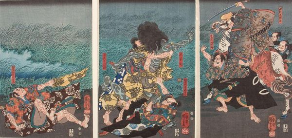 This woodblock print was made by Tsukioka Yoshitoshi, likely in the late 19th century, and exemplifies a technique called *ukiyo-e*. To make these prints, artisans, not the artist themselves, carved a series of woodblocks, one for each color. These were then carefully inked and pressed onto paper, building up the image in layers. Look closely, and you'll see how each line is clearly delineated, a testament to the sharp knives used in carving. The flat planes of color are characteristic of woodblock printing, where subtle gradations are difficult to achieve. What's fascinating about ukiyo-e is its reflection of a burgeoning consumer culture. These prints weren't unique artworks, but rather, mass-produced images sold to a wide audience. They catered to popular taste, depicting famous actors, beautiful women, and, as in this case, historical or legendary scenes. It was a form of art deeply embedded in the commercial realities of its time. It blurs the line between high art and accessible, affordable imagery.