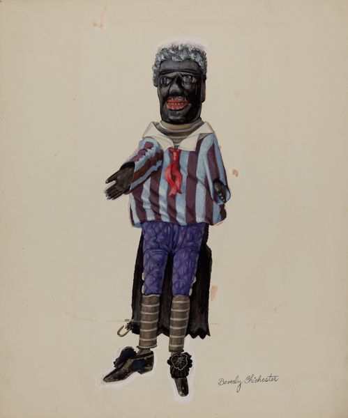 This is "Barnacle Bill" Puppet, by Chris Makrenos. It’s undated, but with the artist’s lifespan, it probably dates from the mid to late 20th century. There's something so endearing about this puppet; it's like Makrenos has captured a whole character in these simple forms. He's used paint to bring the puppet to life, creating texture and depth. The contrasts of the matte, opaque white paint on the trousers with the plush black of his velvet jacket, you can almost feel the different textures. The face is really interesting. See how the eyes are these bright, almost cartoonish green dots, which sit in stark contrast to the deep red of his lips and ruddy cheeks? The face is carefully crafted with an enormous amount of detail, which is so interesting. It's like a miniature portrait. It brings to mind the playful, folksy aesthetic of Red Grooms’ sculptures, don’t you think?