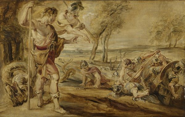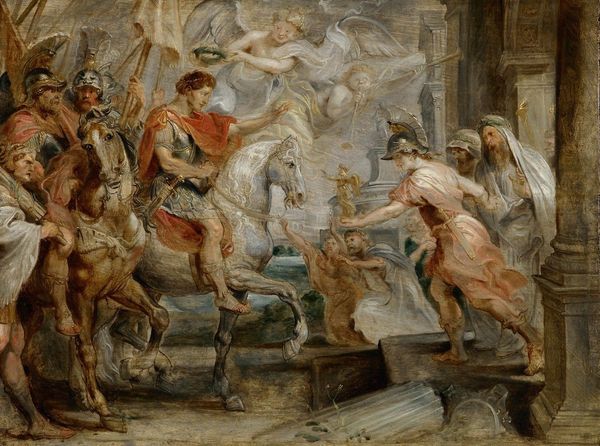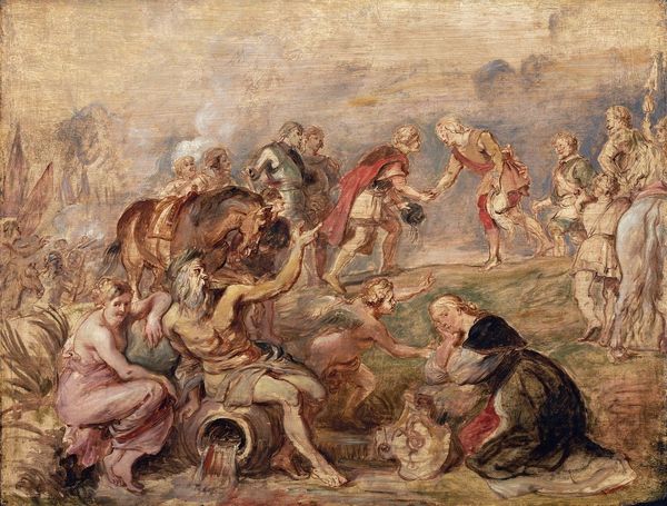 Editor: This oil painting, "The Rape of the Sabine Women," from around 1770, really explodes off the canvas with chaos and movement. It definitely depicts… well, a lot of violence! What stands out to you when you look at this? Curator: Immediately, I consider the social context in which this piece was made. We have to ask ourselves, who was consuming art that depicted such forceful interactions? What did the production and distribution of an image like this communicate about gender roles and the acceptability of violence against women during this period? Editor: That’s a heavy question to start with, but a valid one. But even forgetting the content, the painter clearly spent time layering paint to create such dramatic movement. Curator: Precisely. We should examine the materials used – the pigments available at the time, the types of brushes, the canvas itself. How did the materiality influence the final product, and how did that impact the reception? The way he layers paints contributes to the high drama we are both perceiving, for instance. Editor: You are right. Was art during this time often considered more craft or were artists even then beginning to see themselves differently from artisans? Curator: Good question. The production of such large history paintings involved workshops, assistants, and often a division of labor, similar to craft production. At the same time, artists like this one aimed to elevate themselves beyond mere craftspeople through the intellectual and emotional impact of their works, and aimed at acceptance into elite social and intellectual circles through academies. How can we read this tension between craft and fine art here? Editor: That's fascinating, thinking about it less as high art, and more about the business that allowed paintings like this to be created, viewed, and have significance. I never really considered art in those production terms. Curator: Exactly. Understanding the process, the materials, the economic structures, that informs a whole new way to understand art of this time!