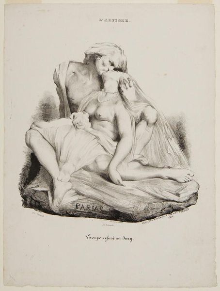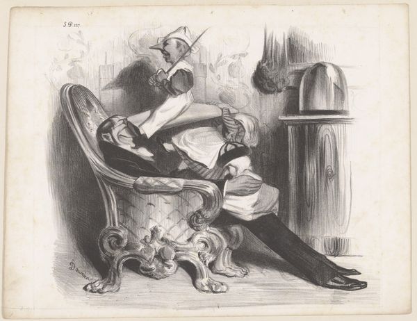 Editor: Here we have Honoré Daumier's lithograph, "The Nightmare." The figure seems so burdened, almost suffocated. What do you see in this piece? Curator: Ah, the pear! It's not just a fruit here. During the July Monarchy, the pear became a satirical symbol for King Louis-Philippe. What memories and associations might that visual shorthand evoke for viewers of the time? Editor: So the pear shape equals a specific political figure? It’s fascinating how an image becomes a vessel for cultural memory. Curator: Exactly. And consider the title, "The Nightmare." It's not just a personal torment, is it? It’s a societal one, played out through the symbolic weight of the pear. Editor: That gives the image a whole new dimension. I'll never look at a pear the same way again! Curator: Indeed. Symbols are powerful tools, aren't they? They shape not only what we see, but also what we remember.