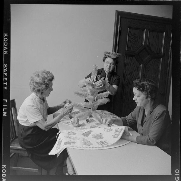 Editor: This photograph, "Untitled (guests eating at reception)" by Martin Schweig, shows a group of people at what appears to be a formal gathering. It feels very staged, very much a document of a specific social class. What stands out to you? Curator: It's interesting to consider this image as a document of power, isn’t it? The seemingly mundane act of eating becomes a performance, reinforcing social hierarchies. Who is invited to the table, and who isn’t? What narratives are being written in this space? Editor: I hadn’t thought about it that way, but that makes sense. It's like the photograph itself becomes a gatekeeper. Curator: Exactly! Consider the photographer's role too. Are they complicit in this performance, or are they offering a critique? It invites us to question the unspoken rules and expectations of the time. Editor: I guess it's more complex than just a snapshot of a party. Thanks! Curator: Indeed, art often invites us to unpack the loaded narratives behind seemingly ordinary scenes.