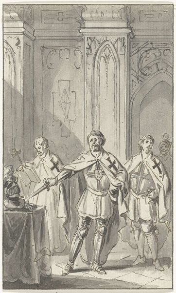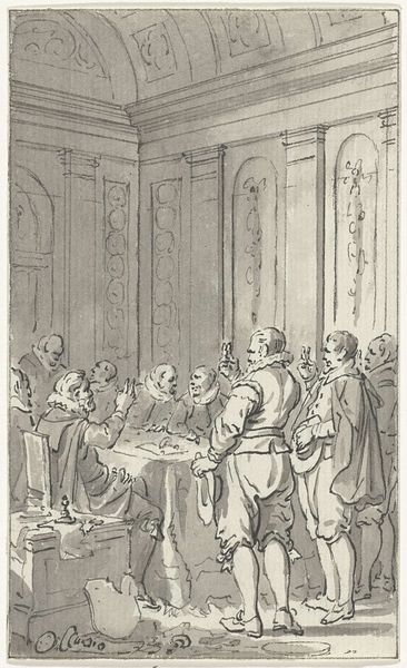 Editor: So, here we have Jacobus Buys's "Inzwering van Karel V te Dordrecht, 1515," made between 1780 and 1795, using ink, etching and drawing techniques. It feels quite formal, almost staged, despite depicting an historical event. How do you interpret this work? Curator: Considering it was made over two centuries after the depicted event, it invites questions about the Dutch Republic's identity construction. This drawing idealizes a specific historical moment, but who does it serve and whose stories are being sidelined in this depiction of Charles V's acceptance in Dordrecht? Editor: That's interesting. I hadn't considered the political context of when it was created. What are some of the critical aspects we should note when discussing history paintings, in particular? Curator: Consider the choice of subject, the style and period in which the art was created and what prevailing ideologies were present. How does the image reflect or challenge power dynamics, particularly the historical portrayal of leadership, in terms of race, gender, and class? Is there perhaps an implicit, even unconscious, justification of colonial power at play? Editor: Now that you mention it, the uniformity of the figures does erase any possible diversity, making me wonder about representation during that time. Curator: Exactly! Also, think about who had the resources to create and commission such art. Questioning the narrative presented opens up pathways for inclusive dialogues. What previously unexamined biases might surface? Editor: It certainly highlights the importance of critically assessing historical narratives within art, acknowledging diverse perspectives and understanding how power and privilege are woven into the art itself. It’s much more than just the depiction of one event in the past. Curator: Precisely. We gain richer, more honest engagements with both art and history through this line of questioning.